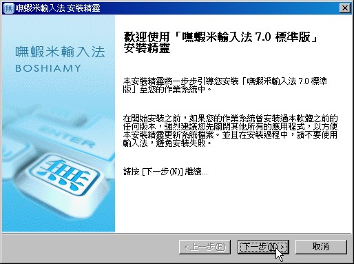 現在要做的當然是安裝輸入法嘍,點一下「安裝嘸蝦米輸入法 7.0」就會出現輸入法本身的安裝程式,