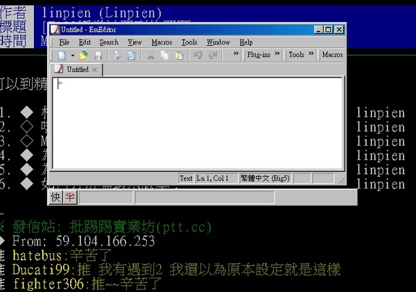 不過實際使用後會發現,在某些程式(比如說 Firefox 之下),雖然可以把嘸蝦米視窗拉到工作列上,但是一按 Ctrl-Space,切換成英文再切換成中文之後,嘸蝦米視窗會回到原來的位置;另外,如果同時勾選「永久記憶狀態列位置」和「狀態列最上層顯示」,嘸蝦米視窗也不能拉到工作列上。所以這個功能並不是無往而不利的。 - 狀態列跟隨在視窗下緣